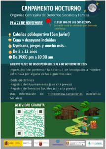 El campamento nocturno será uno de los siguientes días 14 ó 21 de noviembre de 2025. A elegir una de las dos fechas disponibles en la solicitud. Es imprescindible presentar la solicitud de inscripción del día 3 al 6 de noviembre de 2025 a nombre del menor por una de las siguientes vías:
